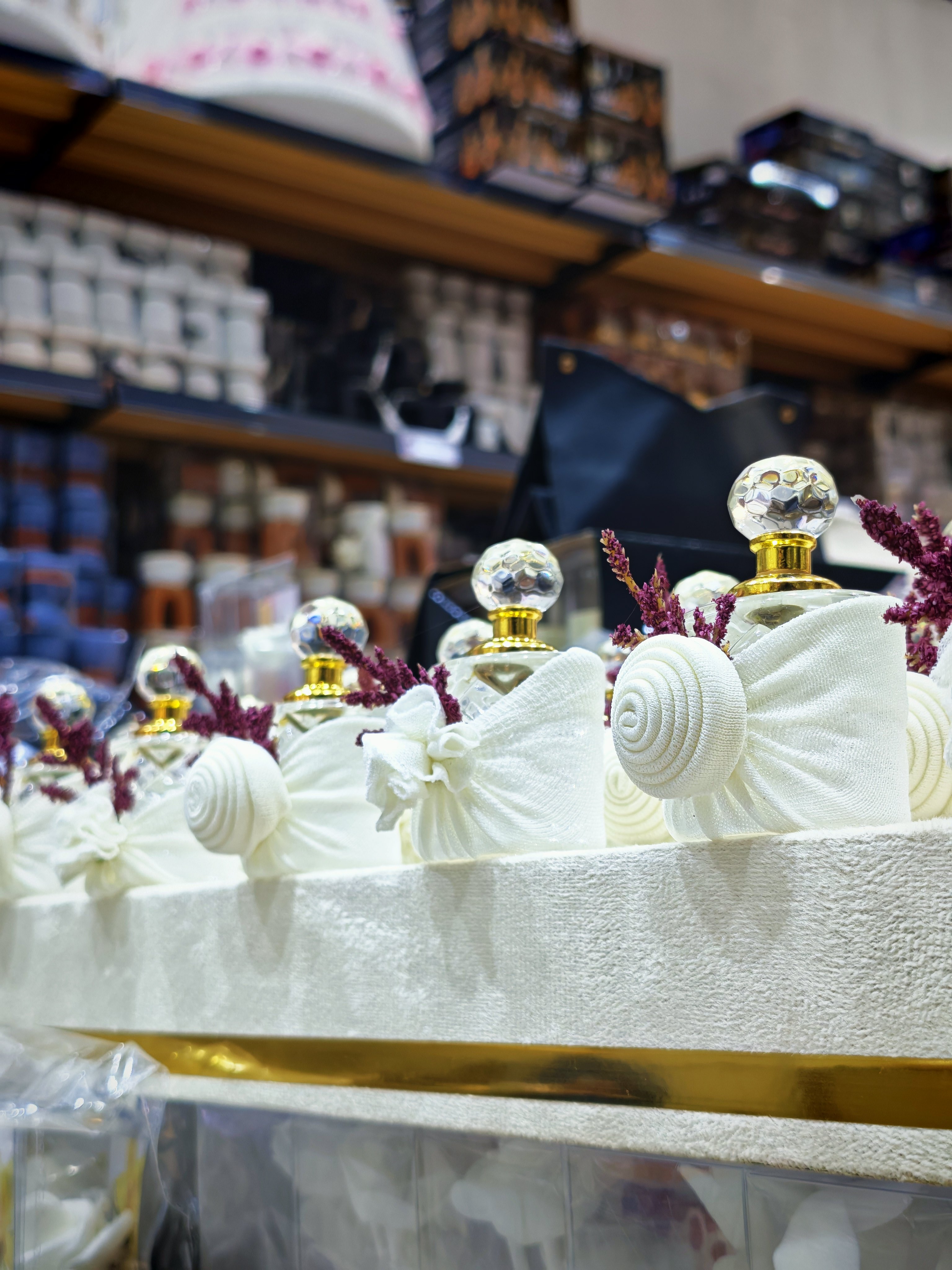 الكمية: 35 تولة كرستالية صغيرة (عبوات عطر) ذات غطاء كريستالي أنيق وعنق مذهب.